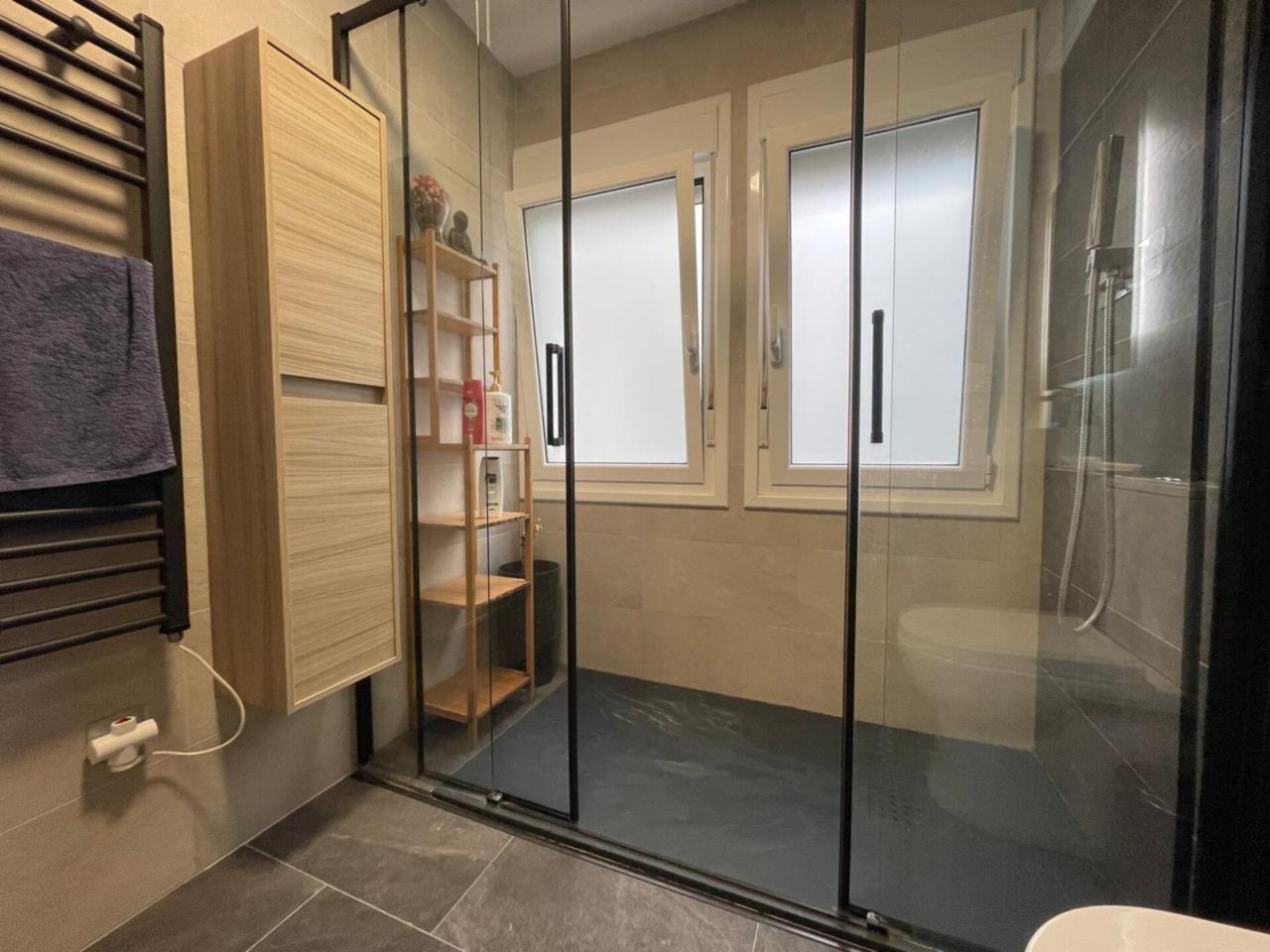 El cuarto de baño con todo los detalles como secador de toallas, amplia ducha, diseño de lavabo suspendido y con ventanas que aportan luz natural al espacio.